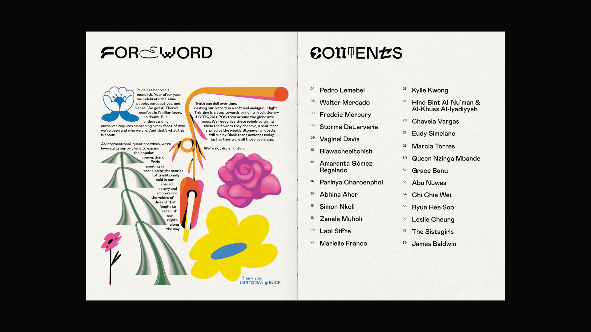 This project was concepted, researched, written, designed, produced, and printed entirely by members of the LGBTQ2I+ community. The majority of illustrators were also a part of the community, with a few allies included. Thank you to the whole team, especially to Ayla, Zoe, Asia, Kevin, Kim and Dara. 𖡼𖤣𖥧𖡼𓋼𖤣𖥧𓋼𓍊✿